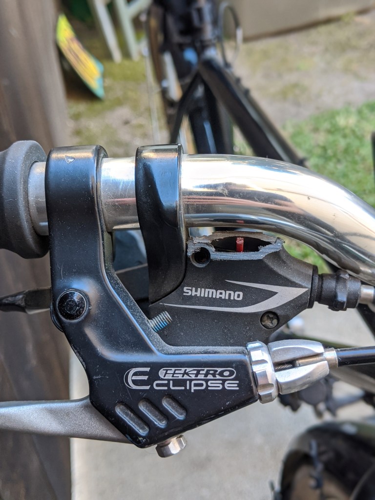 Minor damage on the right hand shifter. It’s missing its position indicator. Everything else on the bike is in really good shape.