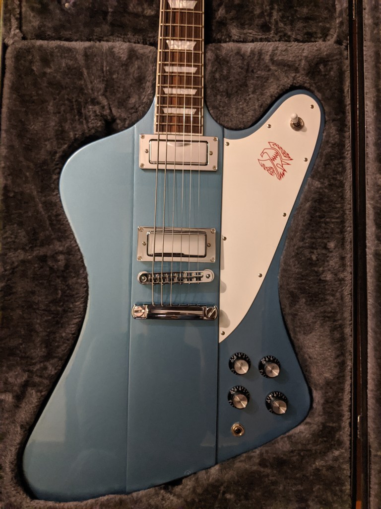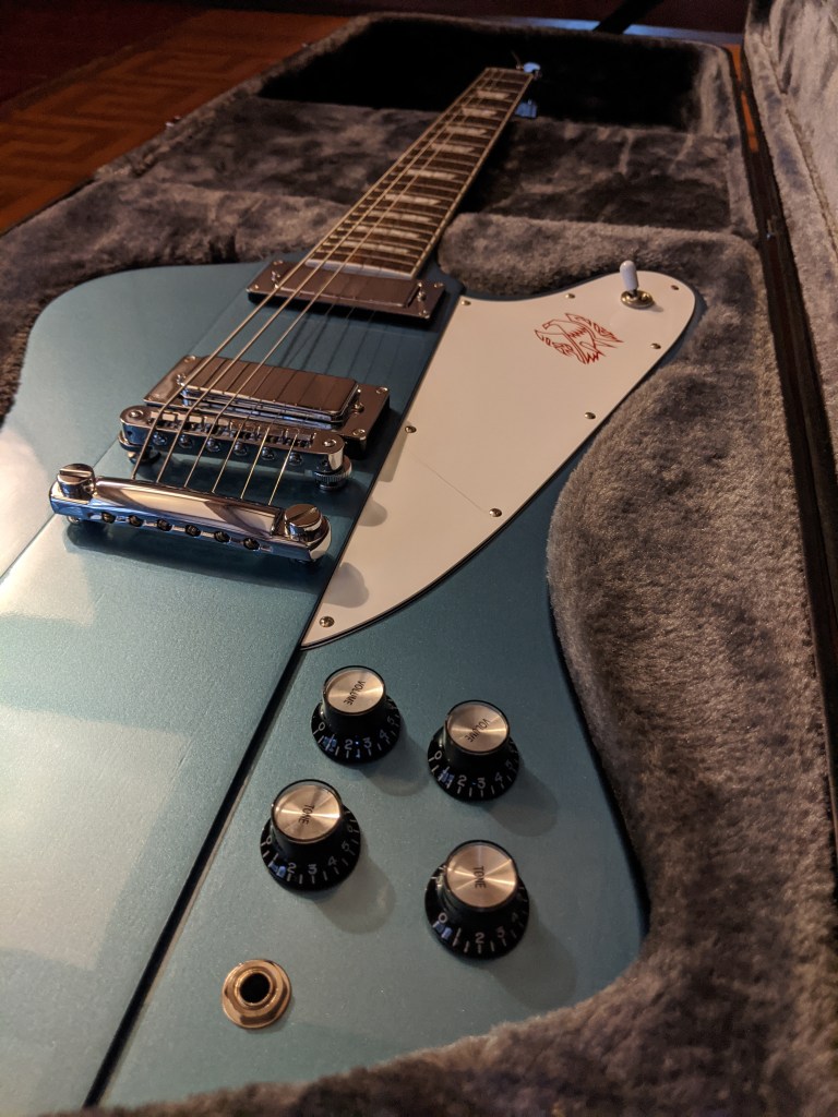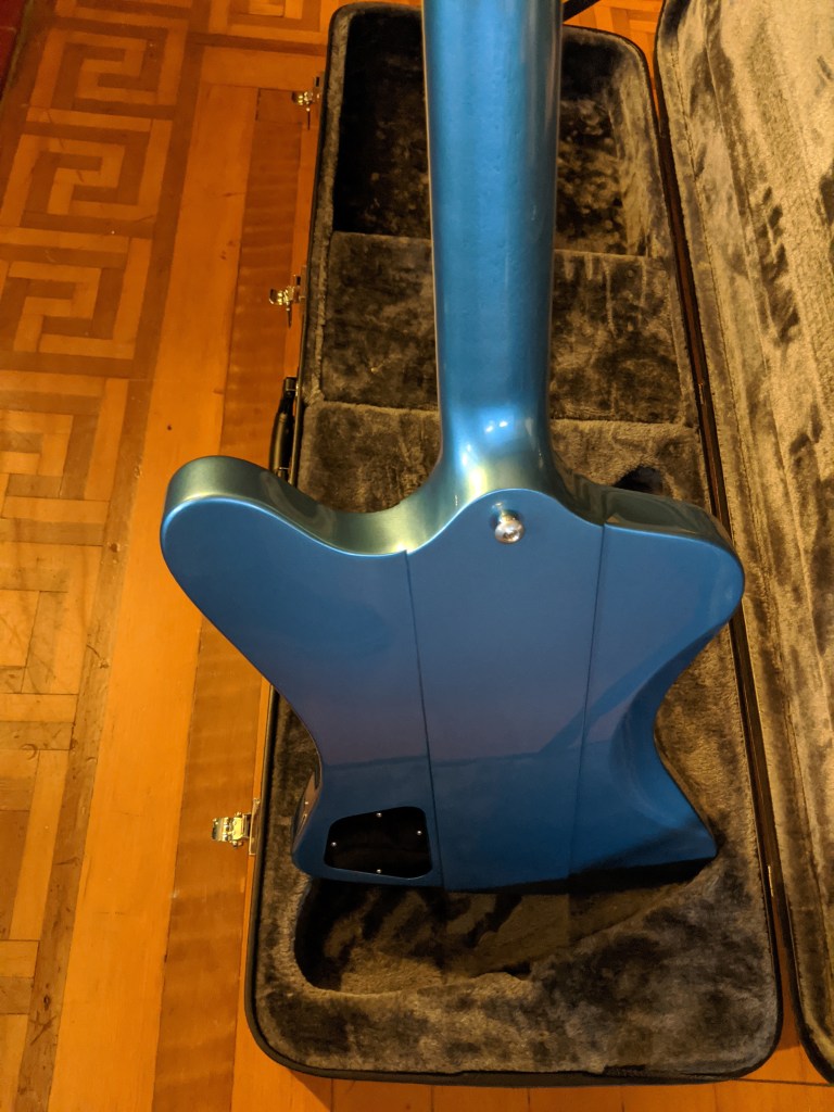 I have for trade a beautiful 2017 Gibson Firebird T electric guitar in pelham blue. The guitar is in excellent condition. It is all stock and has been very well cared for and not played much. The previous owner purchased it and played it some, but never gigged, and the guitar lived in its case. No dings, dents, or scratches, though there is one small blemish around the base of the body on the front side. No wear, no buckle rash, this guitar is in incredible shape.