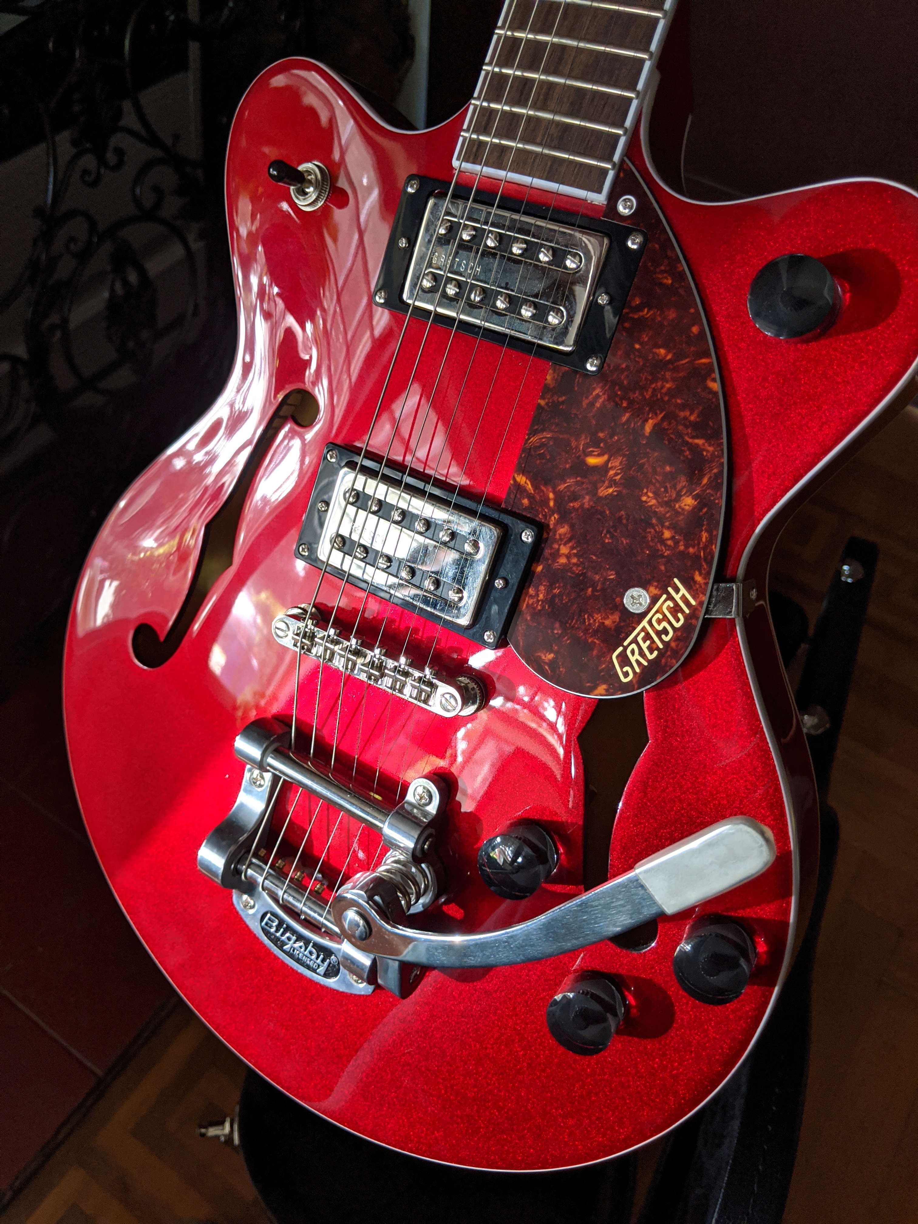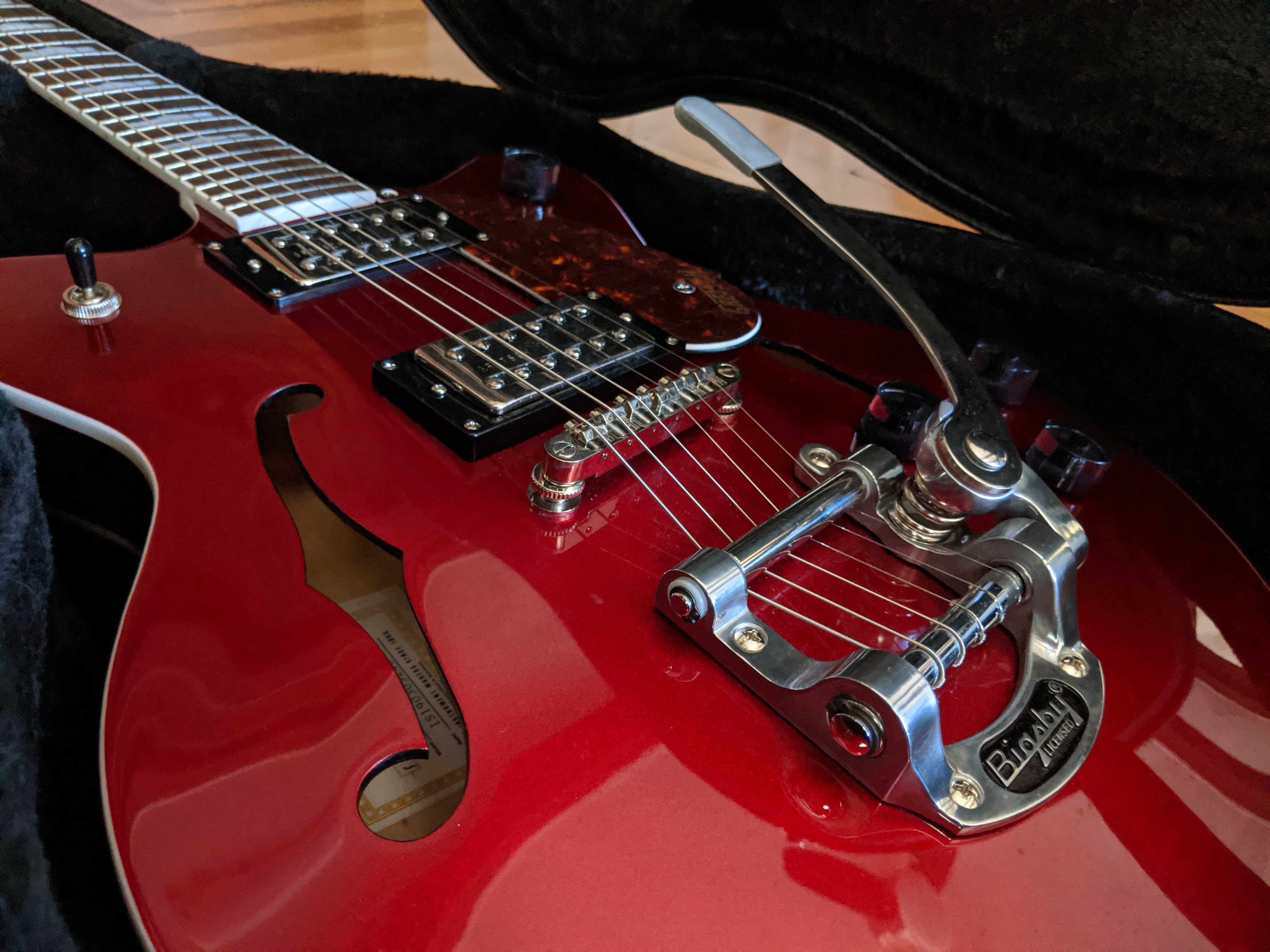 I have for trade an almost-new 2019 Gretsch G2657T Streamliner Center Block Jr. Double-Cut electric guitar with Bigsby in candy apple red. I’m seeking to trade this guitar, not to sell it, so please let me know what you have to offer!