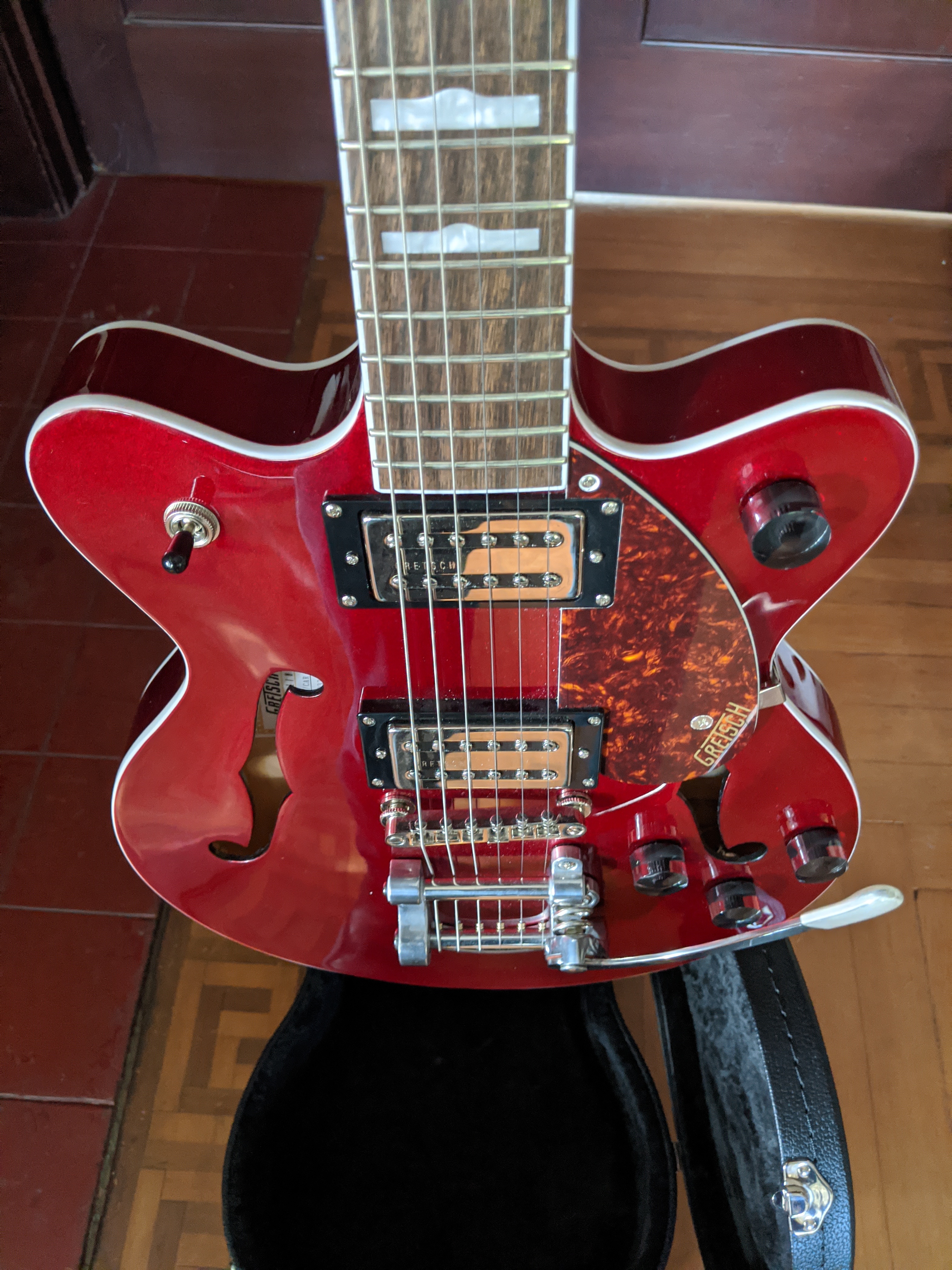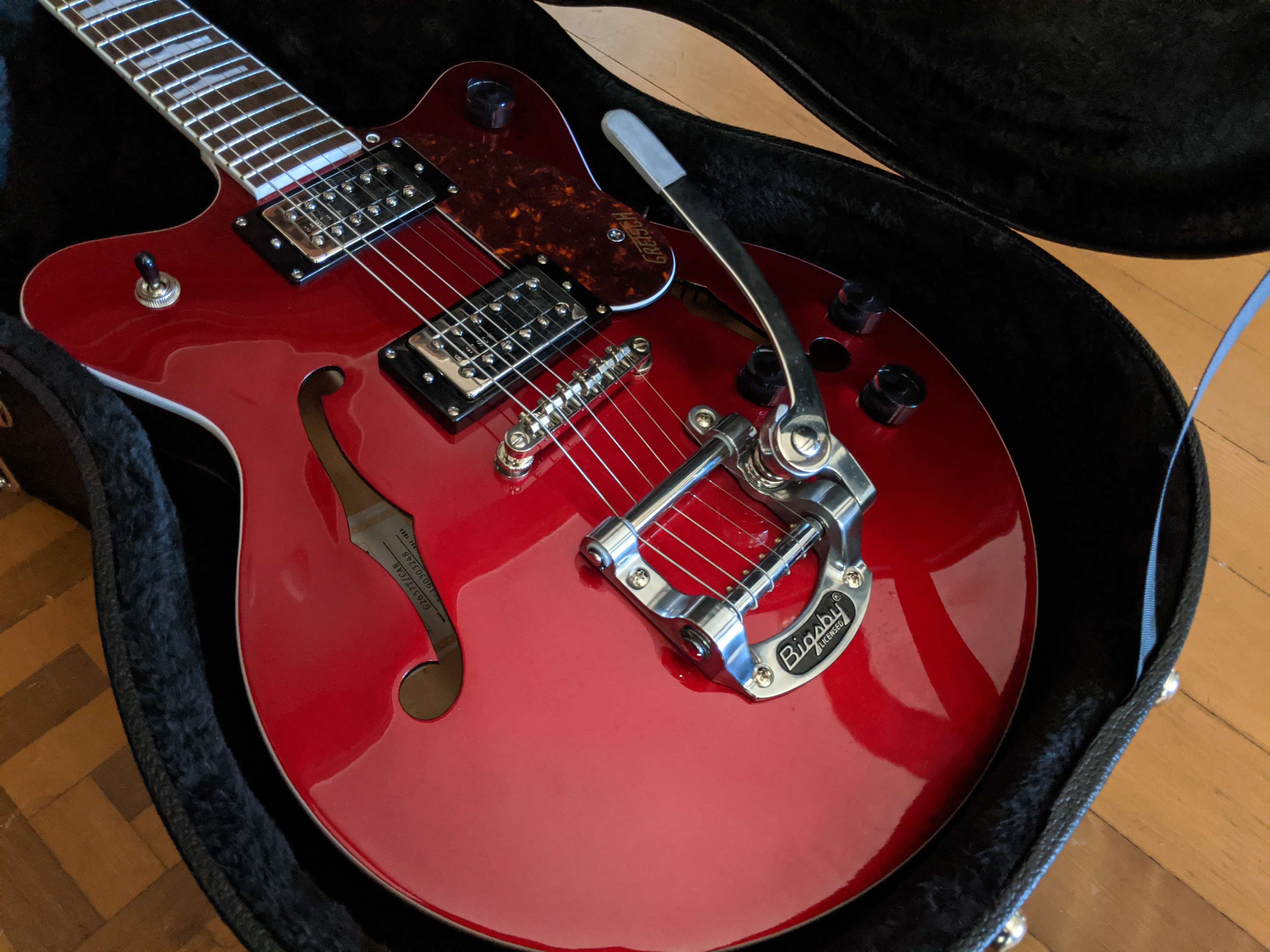 This is an almost-new 2019 Gretsch G2657T Streamliner Center Block Jr. Double-Cut with Bigsby in candy apple red. This guitar was made in March 2019, purchased from Guitar Center in January 2020, and barely used. All parts — body, neck, headstock, pickups, bridge, Bigsby — are in perfect condition. Comes with a Road Runner hard case.